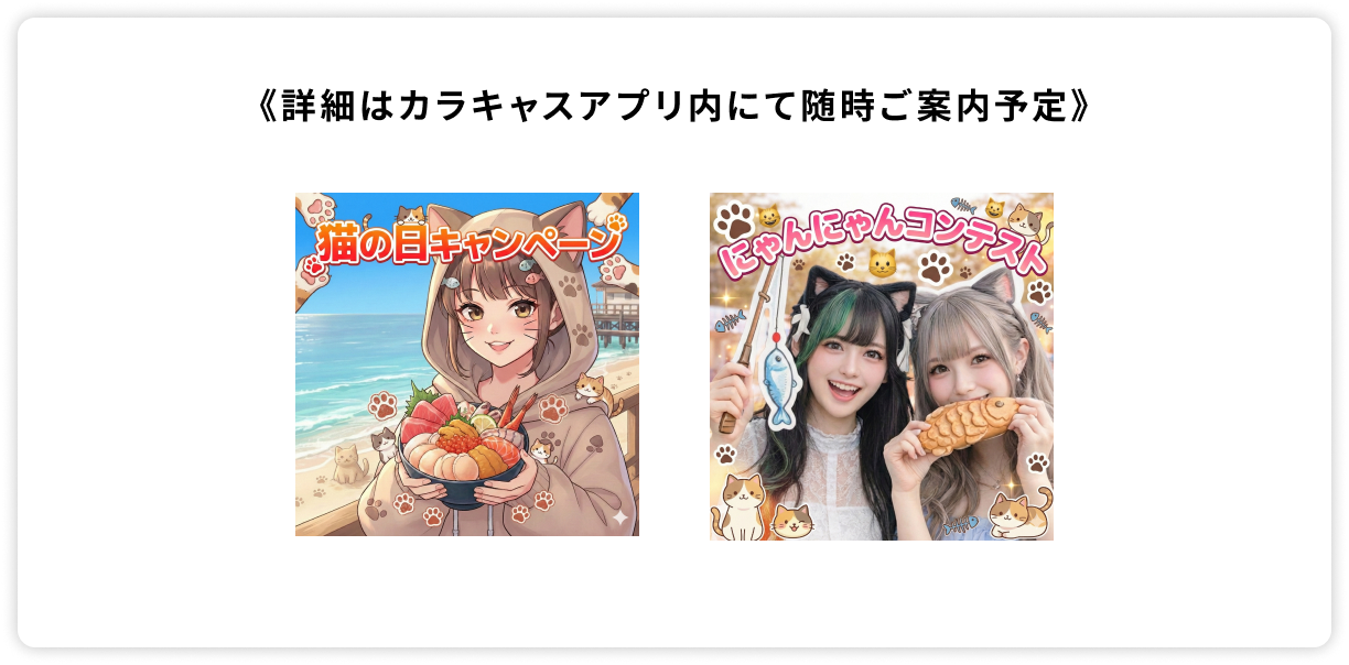 - 本キャンペーン「#カラキャスギャラ祭り」(以下「本キャンペーン」)は、カラフルキャスティング株式会社(以下「当社」)が主催します。